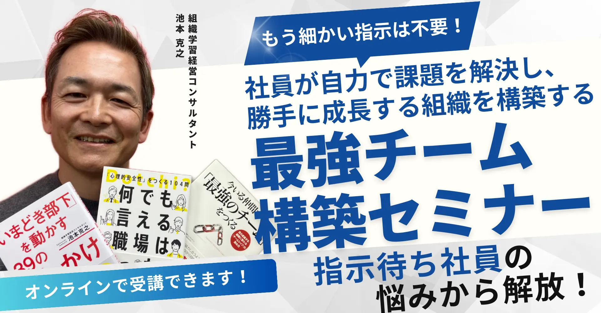 その経験と知識に基づき、最強組織を構築していくために、あなたが抱える個別の問題を池本克之が直接お答えして解決します。無理な勧誘は一切ありません!